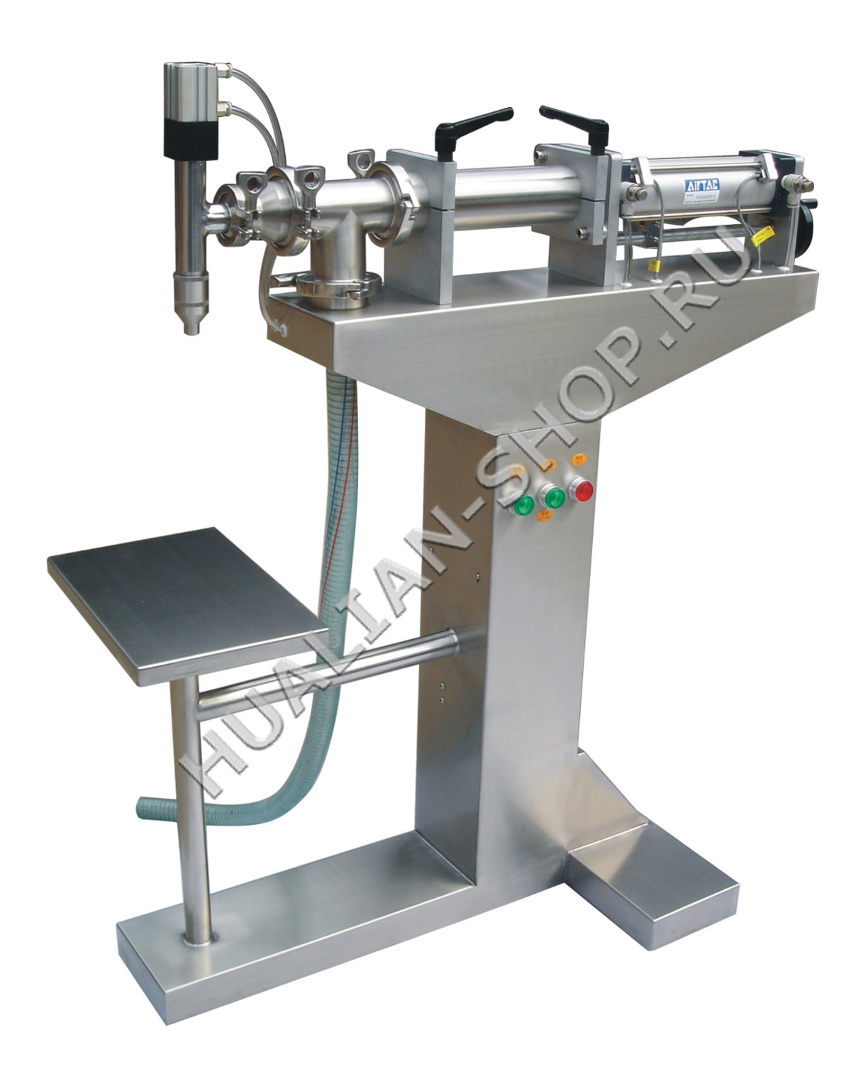 Настольный поршневой дозатор для жидких и вязких продуктов с бункером. Дозатор имеет диапазон дозирования 100-2000мл., предназначен для дозирования продуктов различной вязкости, имеет загрузочный бункер вместимостью около 30 литров. С помощью механической регулировки, можно легко менять диапазон дозирования в пределах допустимого значения. Дозатор является настольным, очень компактный и легкий, выполнен из нержавейки. Имеет электро педаль для запуска процесса дозировки, так же может работать в автоматическом режиме. Дозатор используется в процессе розлива/дозирования различных жидкостей и пастообразных продуктов, таких как: масло растительное, различные соусы, крема, гели, эмульсионные растворы и т.д. Необходимо подключение воздушного компрессора.