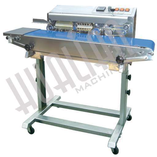 Направление движения пакета — слева направо. Температура регулируется при помощи электронного температурного контроллера, панель управления оснащена регулятором скорости движения конвейера. Корпус оборудования изготовлен полностью из нержавеющей стали. Аппарат подходит для запайки разнообразных термосвариваемых материалов, в том числе и достаточно плотных, запыленных и т.д.